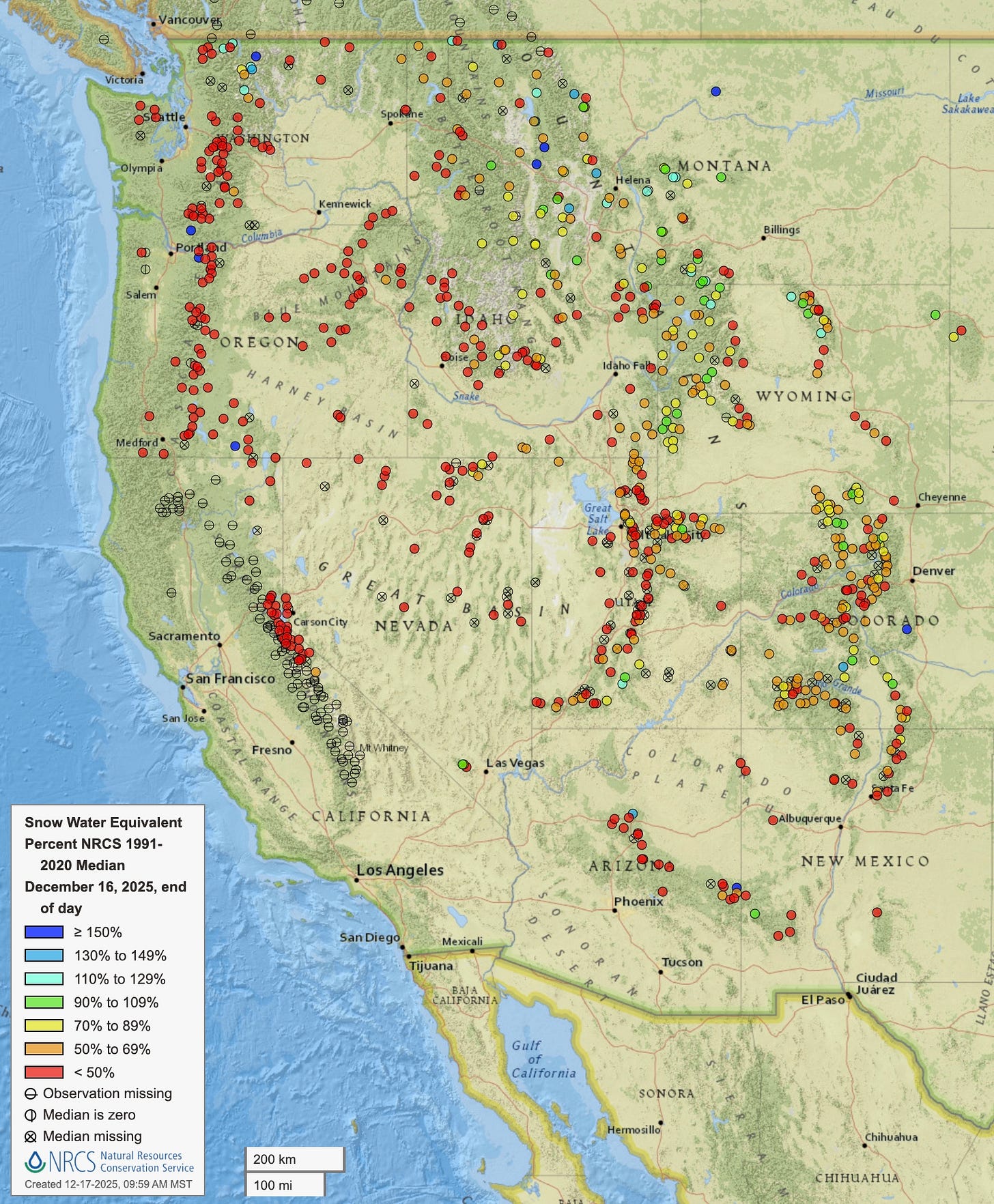The December 16 map below shows the snow water equivalent readings at individual monitoring sites. All those red dots mean this measure of the snowpack’s water content is below 50% of the median (1991–2020); orange dots indicate 50% to 69%.