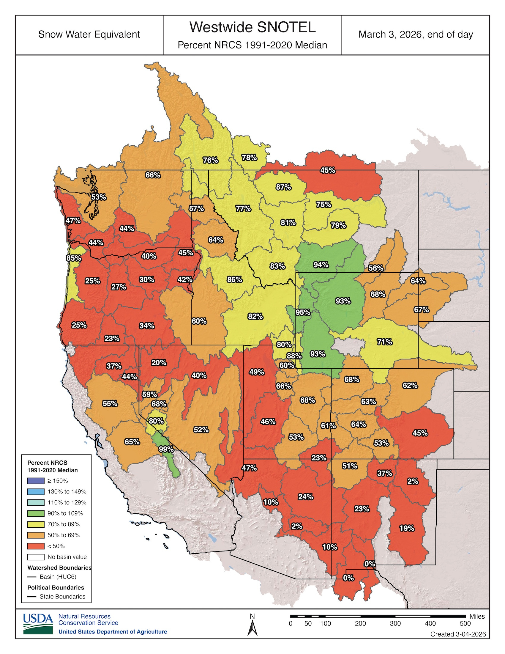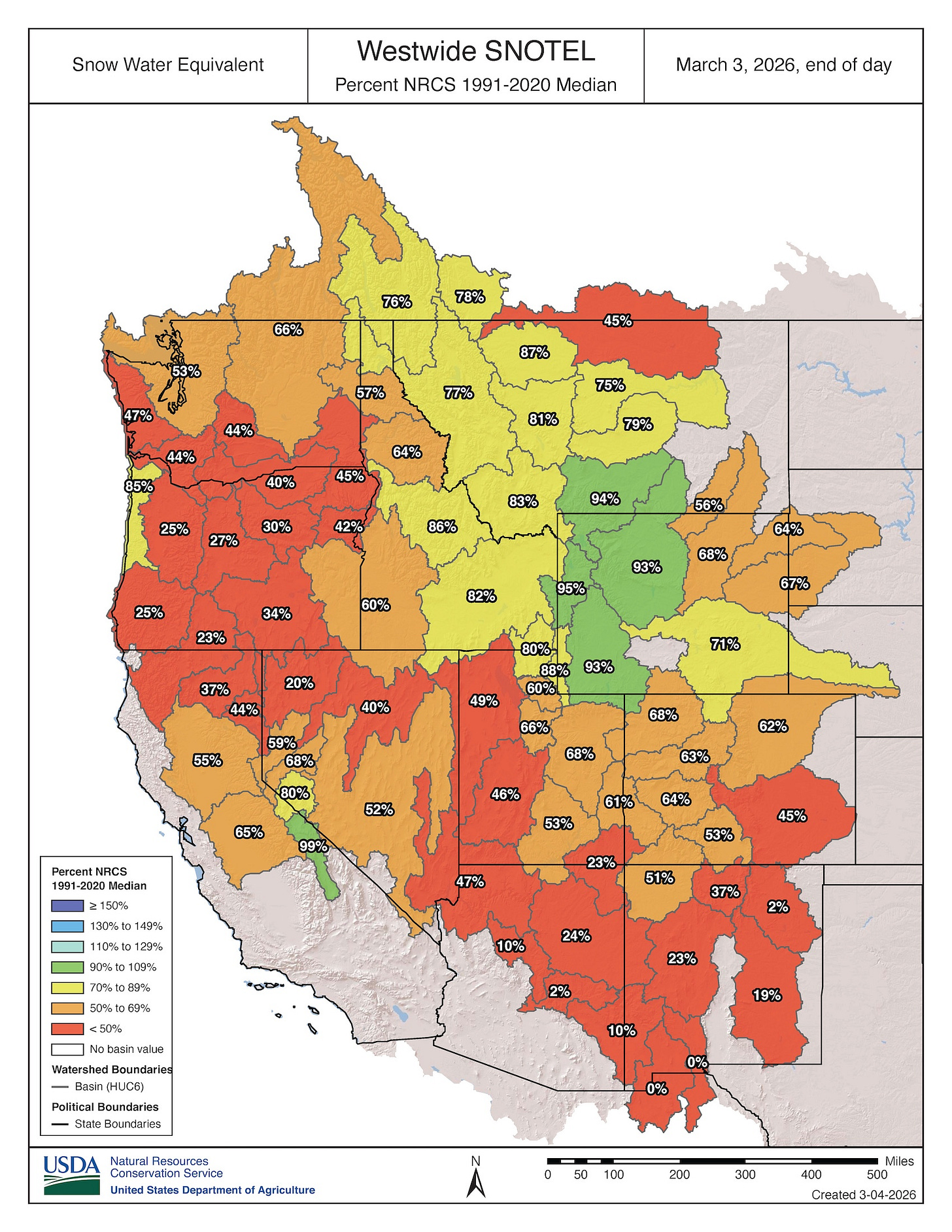 The map below shows snow water equivalent on March 3. Only a handful of river basins are at 90% or greater (green), and none are at 100% or more, while many watersheds remain below 50% (red).