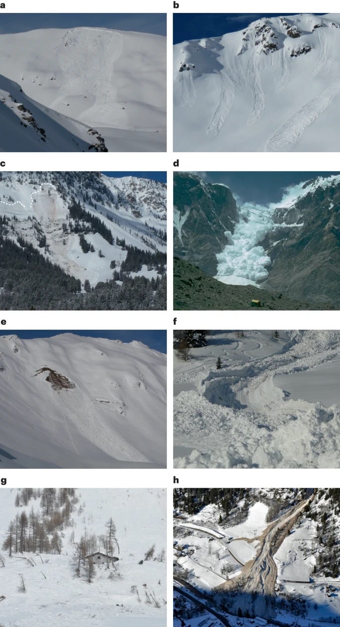 One challenge in studying avalanches is that they manifest in many different ways. The figure below from the 2024 review illustrates eight types of avalanches, each with its own dynamics.