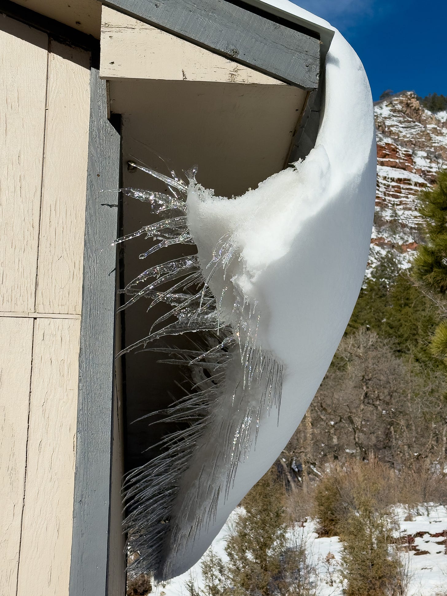 Last year, we added insulation to our attic, so our roof now holds snow longer because less heat escapes from the house. That’s provided a better tableau for observing snow’s metamorphosis. The photo below shows a slab ready to release—right onto the walkway to our front door.