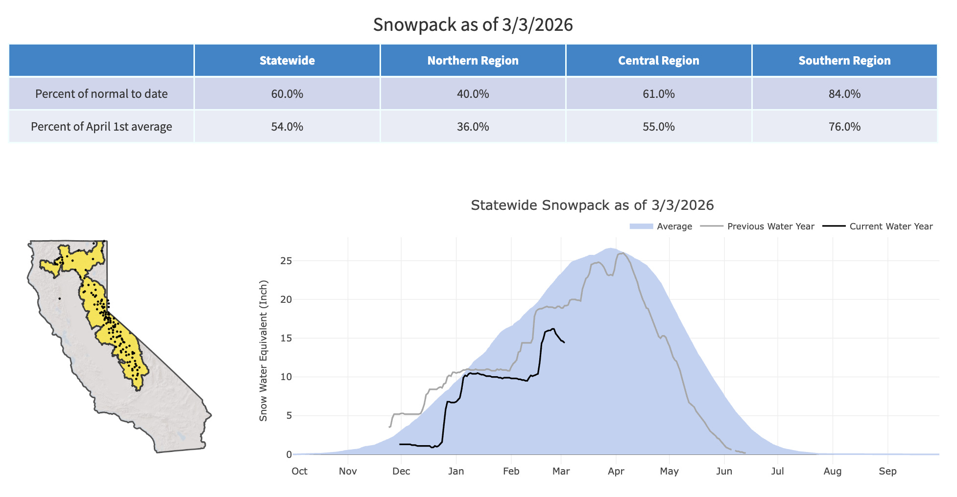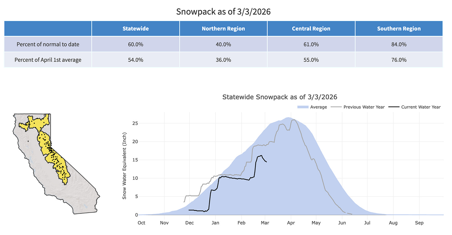 In California, the snowpack jumped after a series of February storms. But the black line in the March 3 chart below shows that the statewide level has declined since then. Overall, California’s snowpack stood at 60% of normal, with the northern region at just 40% and the southern region at 84%.