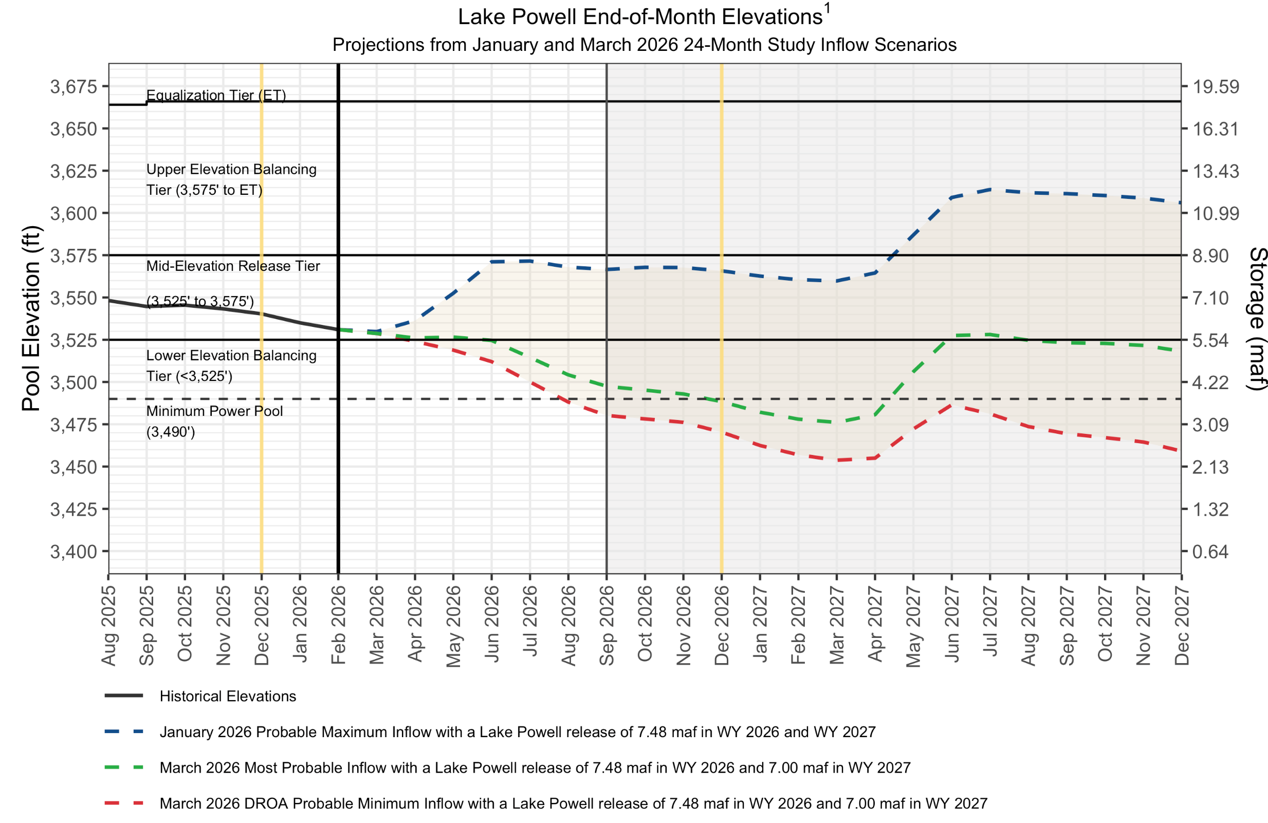 The chart below shows Powell’s projected elevation. The dotted horizontal line, at 3,490 feet, indicates “minimum power pool,” the level below which Glen Canyon Dam can’t pass water through its enormous turbines to generate hydropower. The green dashed line, which marks the “most probable” inflow to Powell, dips below the minimum power pool by the end of this year. The “probable minimum” inflow in red falls below it even sooner—this summer.