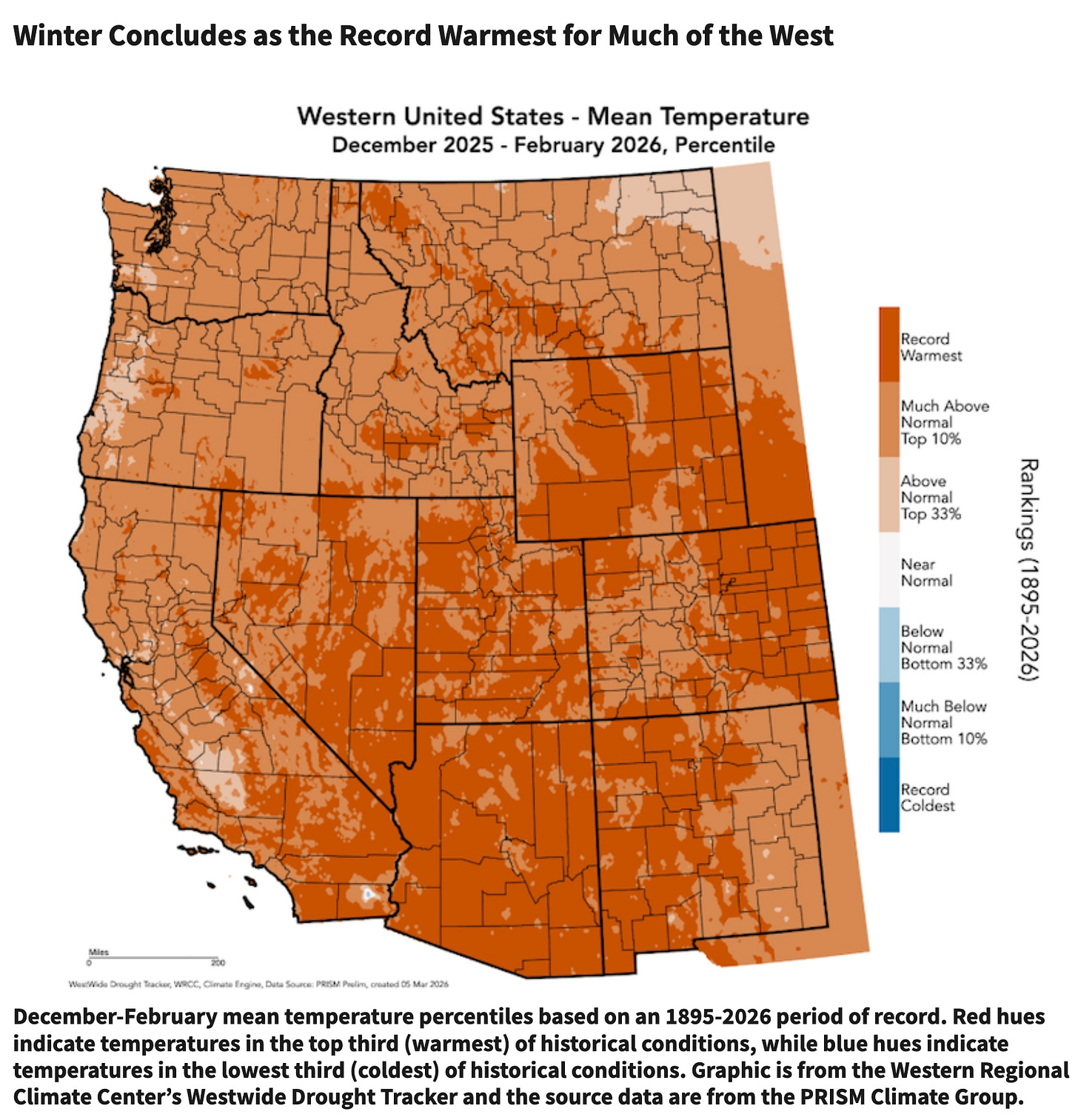 While some parts of the West have been drier than average, even places with normal to above-normal precipitation have seen subpar snowpack because much of that moisture has fallen as rain. The map below shows that from December 2025 through February 2026, record-breaking heat affected much of the region.