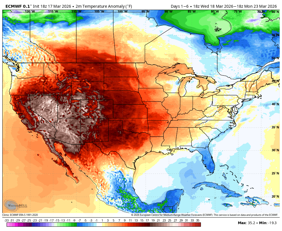 In eastern Utah and western Colorado, some locations will be close to 30 degrees above normal by week’s end, according to the NOAA weather radio I listen to in the shower.