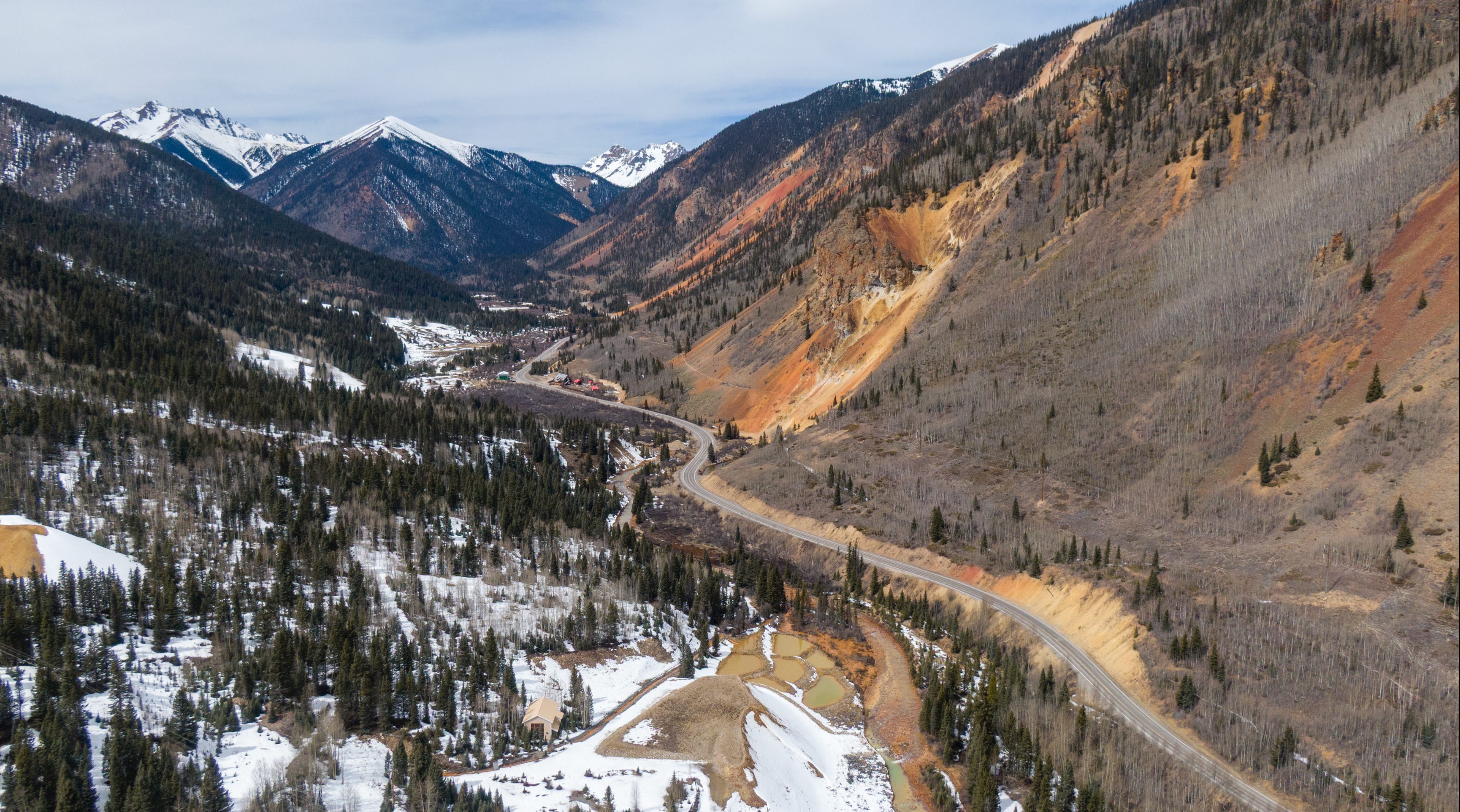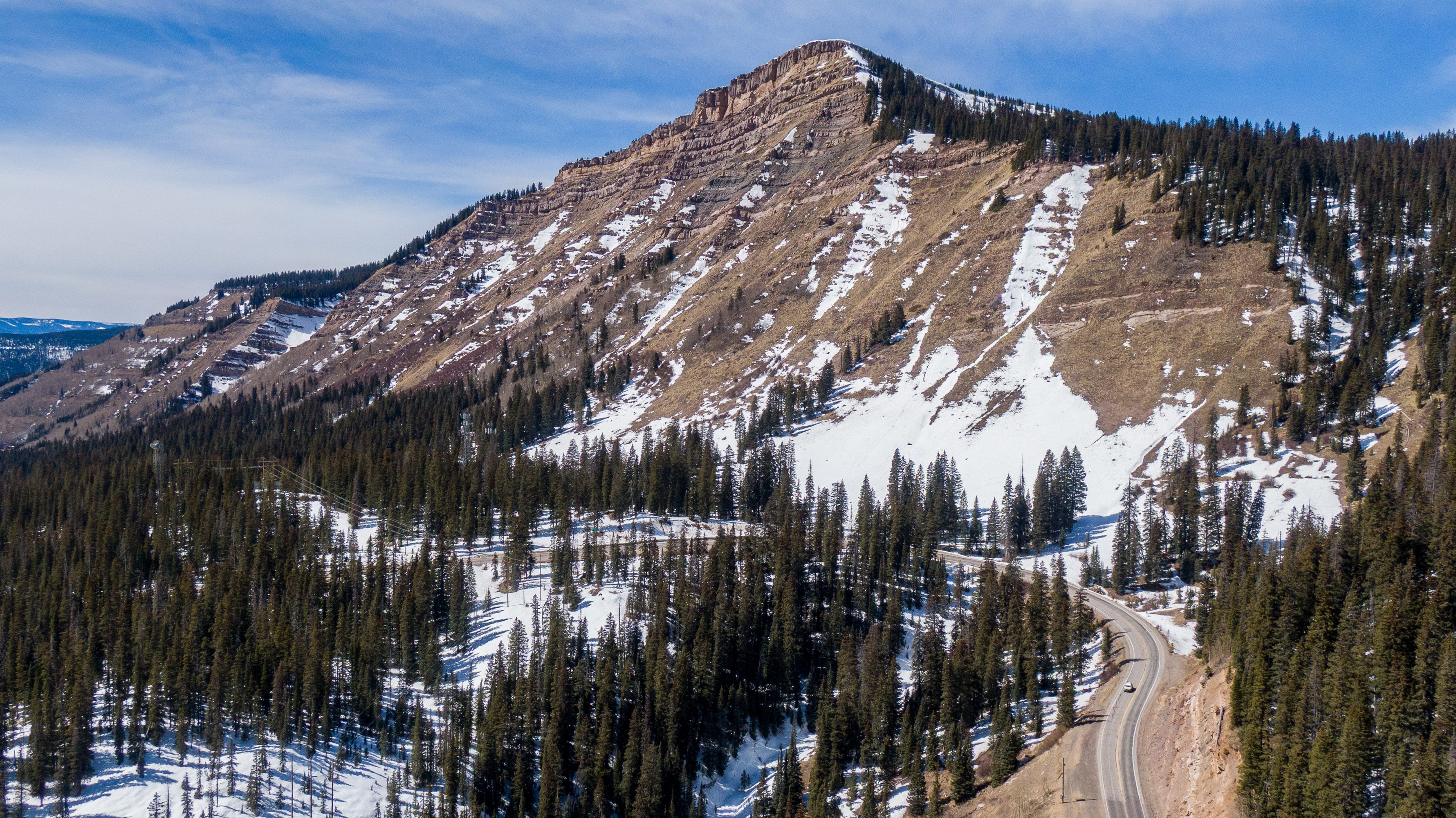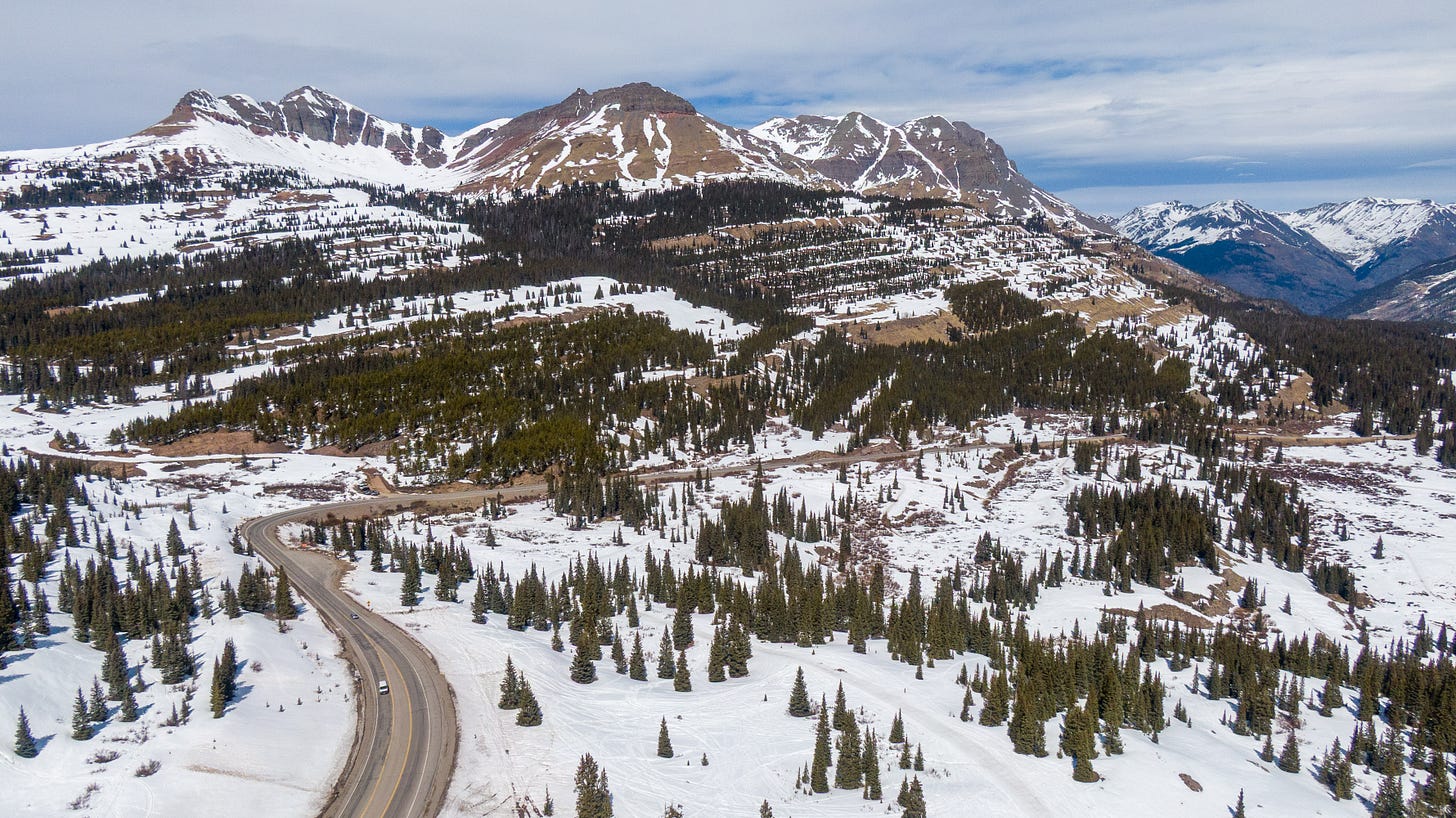 On Saturday, heading to ski at Crested Butte and Monarch, I drove over three mountain passes in the San Juans above 10,000 feet. I used my drone to capture the low-to-nonexistent snowpack.