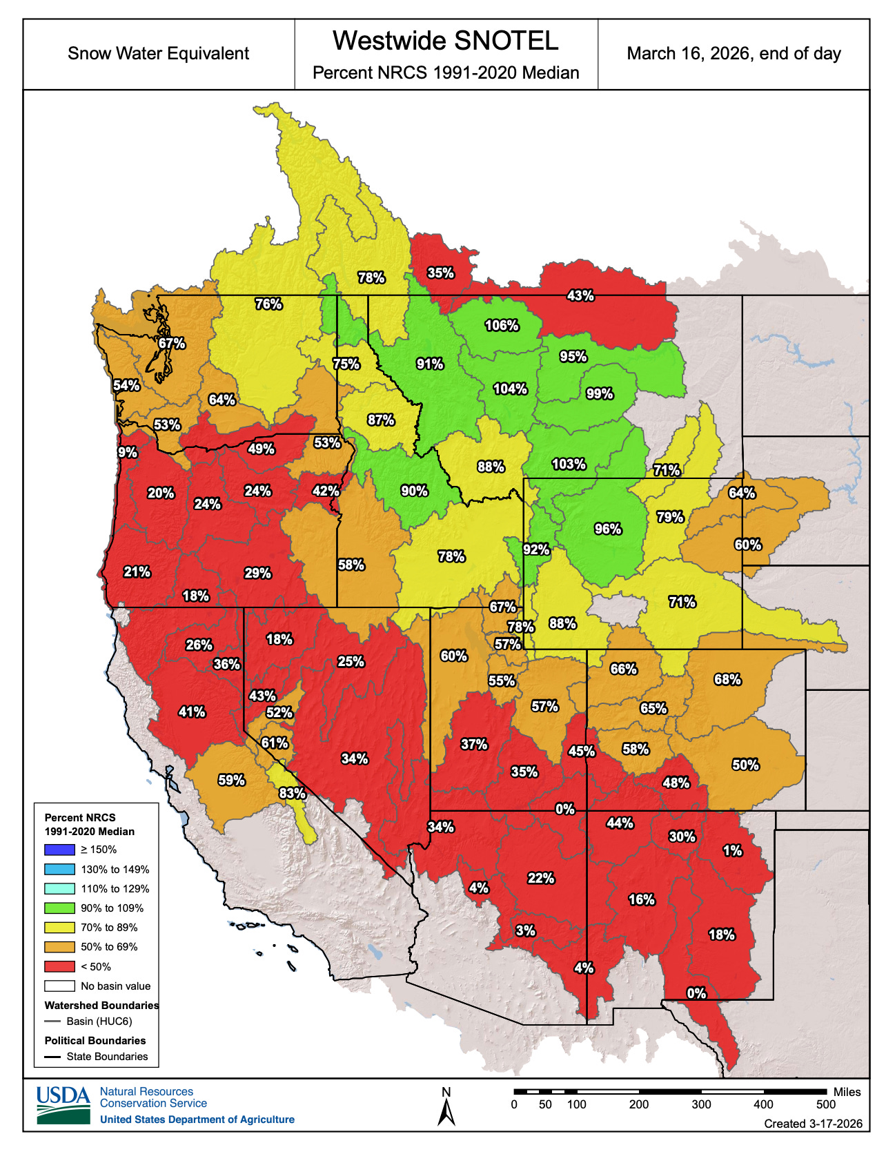 Heading into the heat wave, snowpack readings were bleak across much of the West, as shown in the March 16 map below.