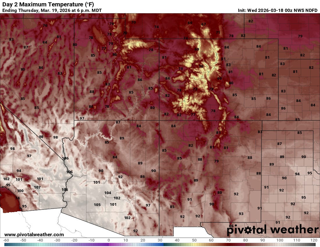 Below are the white-hot temperatures forecast for the Southwest tomorrow. On the last full day of winter, even the high country of the Rockies will be far above freezing while the deserts bake. You can even make out the Colorado River—a white, squiggly ribbon—through the Grand Canyon in northern Arizona.