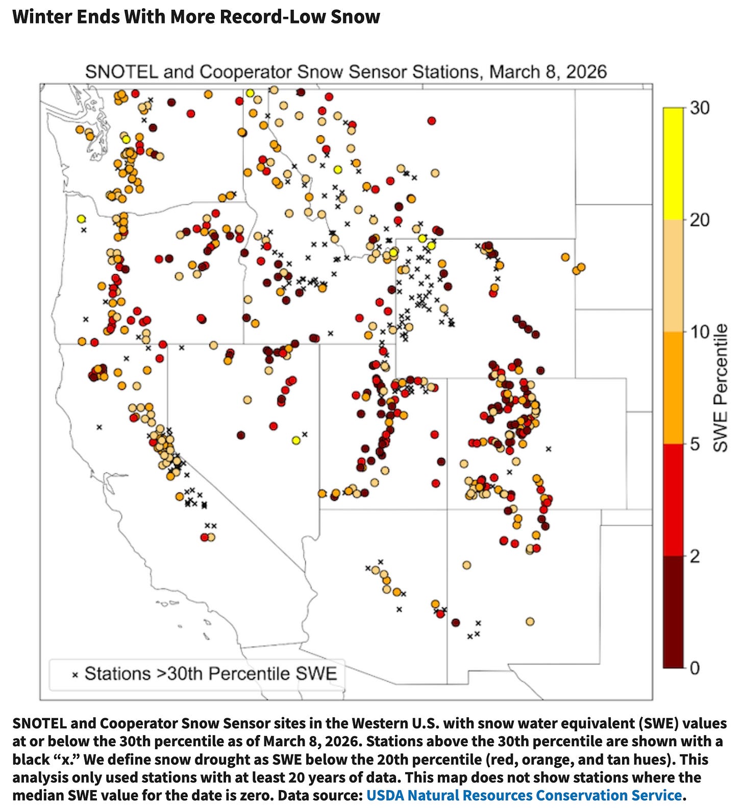 The map below shows snow water equivalent percentiles on March 8. This snow drought is both extreme and widespread, with stations across every Western state falling below the 30th percentile. All those dark red circles are at or below the 2nd percentile.