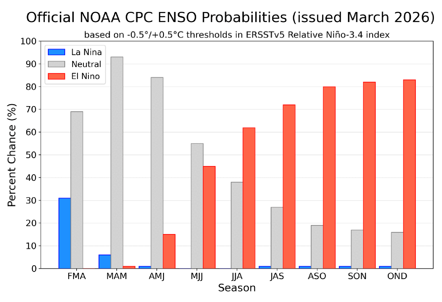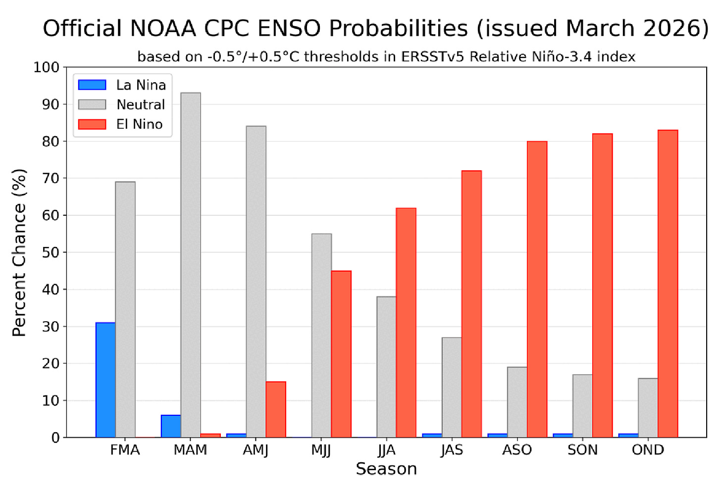 The latest federal forecast on March 12 hoisted an El Niño Watch. The graphic below shows a high chance that this pattern (red bars) will take hold later this year.